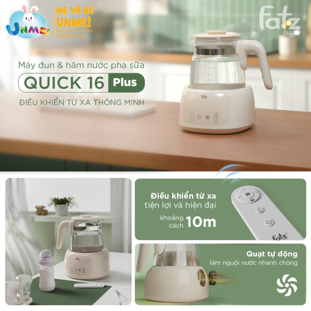 Máy đun và hâm nước pha sữa điều khiển từ xa thông minh Quick 16 Plus với dung tích 1300ml và công suất 800W, là trợ thủ đắc lực cho các bậc phụ huynh.