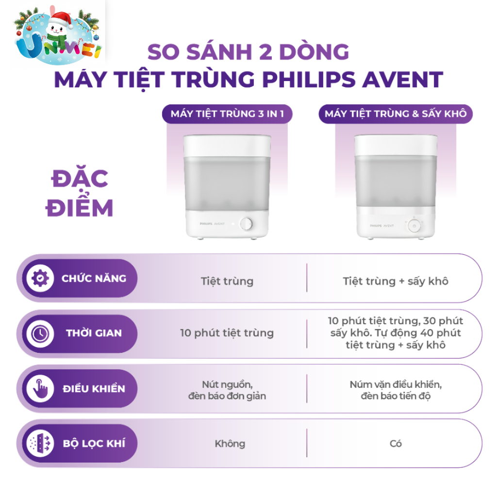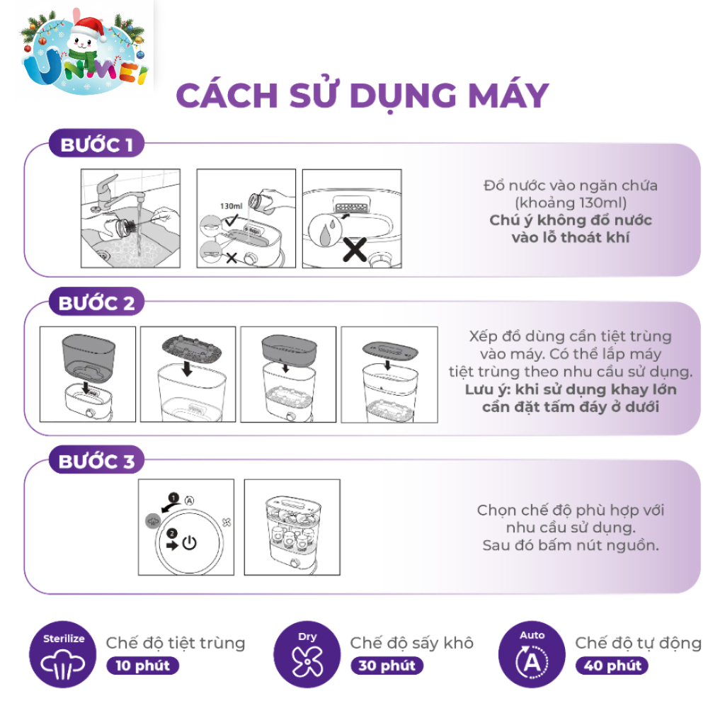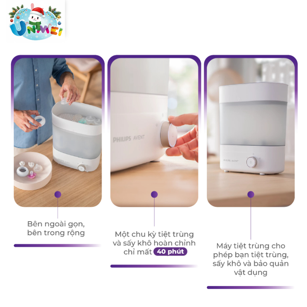 – Chu trình hoàn chỉnh chỉ 40 phút: kết hợp tiệt trùng và sấy khô nhanh chóng, giúp tiết kiệm thời gian cho mẹ.