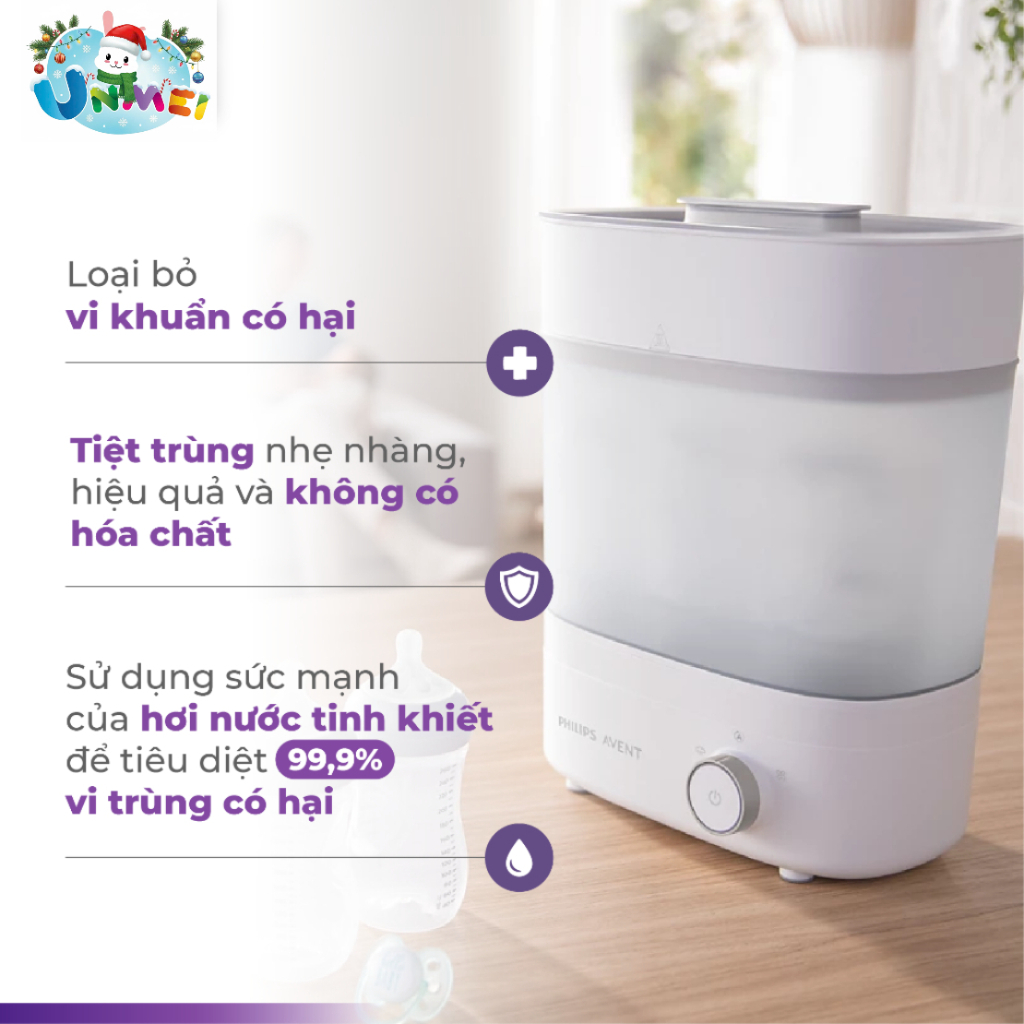 – Tiệt trùng hiệu quả 99,9% vi khuẩn có hại bằng hơi nước tinh khiết, không cần dùng hóa chất, an toàn cho sức khỏe bé.