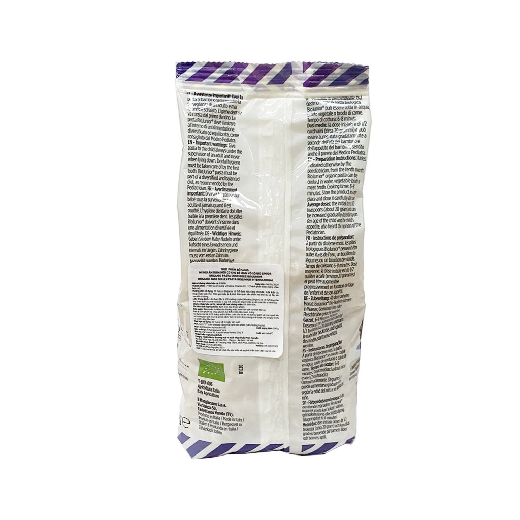Mì nui ăn dặm hữu cơ hình vỏ sò BioJunior là sản phẩm dành có xuất xứ từ Ý. Được làm từ 100% nguyên liệu hữu cơ, sản phẩm không chỉ an toàn với hệ tiêu hoá của con, mà còn cung cấp dưỡng chất giúp con phát triển khoẻ mạnh.